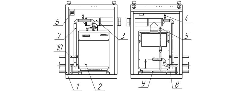 6. Щит управления 7. Подающий трубопровод 8. Обратный трубопровод 9. Дренаж 10. Патрубок присоединения к газопроводу |