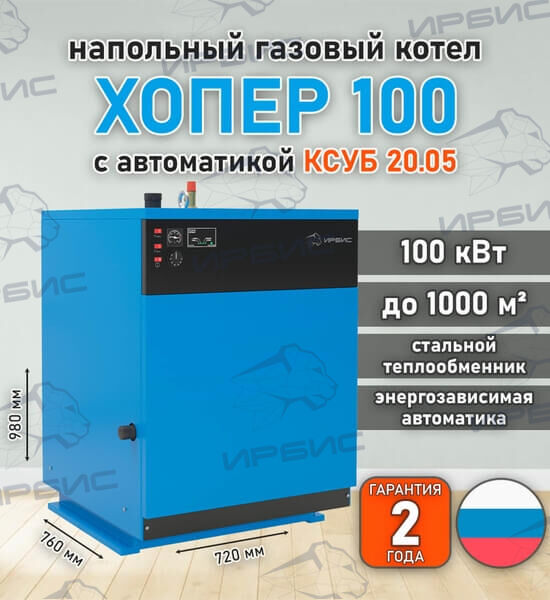 Напольный газовый котел «Хопер 100» с автоматикой КСУБ 20.05 предназначен для водяного отопления жилых, промышленных, складских и прочих помещений площадью до 1000 м².