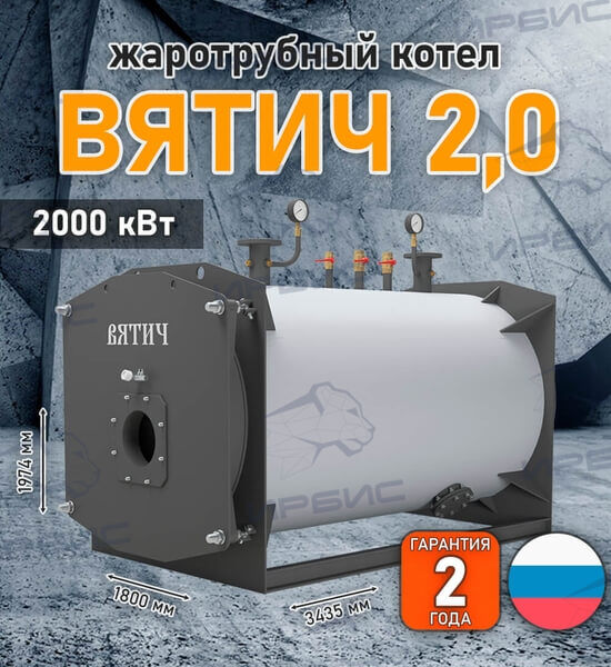 «Вятич 2,0» — водогрейный жаротрубно-дымогарный котел мощностью 2 МВт с реверсивной топкой. Котел «Вятич», в зависимости от типа горелочного устройства, может работать на природном газе или жидком топливе и выполнен в газоплотном исполнении с работой под наддувом.
